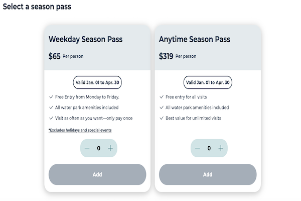 The season pass is currently available at the four Great Wolf Lodge locations and offered in two flexible options: the weekday season pass starts at $65 per person (valid Monday–Friday) and the anytime season pass starts at $269 per person and is valid any day of the week with no blackout dates