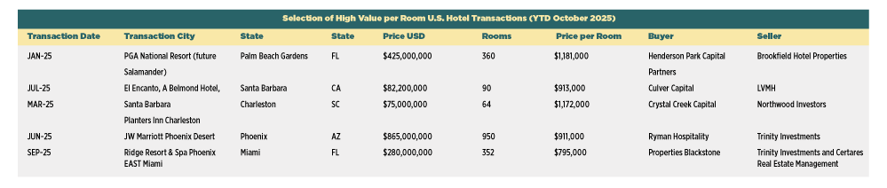 As million-dollar-plus-per-key luxury development costs endure, transactions of luxury hotels in the U.S. are equally frothy and similarly, currently slight. 2025 started off with a bang with Henderson Park’s pickup of PGA National Resort from Brookfield for $425 million ($1.18 million per key). But 2025 has not been a year of abundant transasction, especially at the luxury level, so representative averages by location type is hard. “The velocity of luxury hotel transactions in the U.S. continues to be below the recent peak levels seen during 2021 and 2022,” said Kevin Davis, Americas CEO, JLL’s Hotels & Hospitality Group. However, he is confident that they will pick up. “We expect liquidity for luxury resorts and urban properties to improve in the months ahead, underpinned by robust debt markets, the sheer weight of capital targeting commercial real estate and the higher relative value offered by hotel assets vis-à-vis other property sectors.”