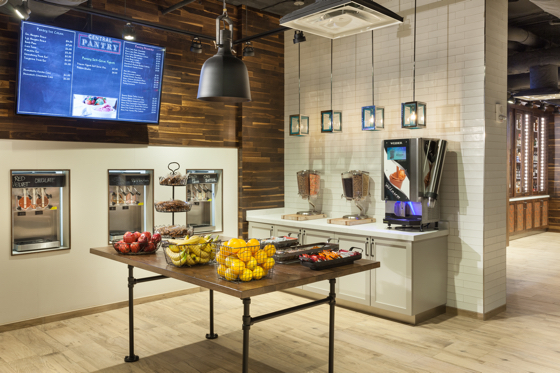 The setting includes everything from freshly prepared local food — think bakery items, crisp salads, gourmet flatbreads — to protein shakes and smoothies, a variety of fresh-brewed coffee drinks, as well as spirits, wines and craft beers self-served on-tap by the glass or bottle.