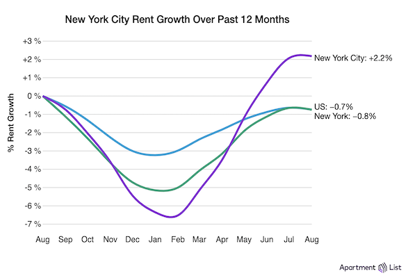 Local Law 18 was ostensibly meant to address the housing crunch, Chesky said, but, according to him, the average rent in New York City is up, unexpectedly, 3.4% (again not citing a source). According to Apartmentlist.com, New York City rental prices are up 2.2% YOY August 2024.