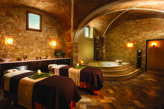 The new Essere Spa occupies the former wine cellar of the 10th-century castle that houses the hotel, in a space complete with barrel-vaulted ceilings and restored stone walls.