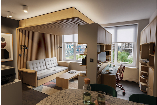 The concept creates transformable furniture and provide more flexible and multi-functional spaces that are also more sustainable because they essentially create two rooms out of one. Imagine a bed that lifts into the ceiling to reveal a table for dinner or desk for work – all at the touch of a button, sound of a voice or swipe of a cellphone. (Watch video below)